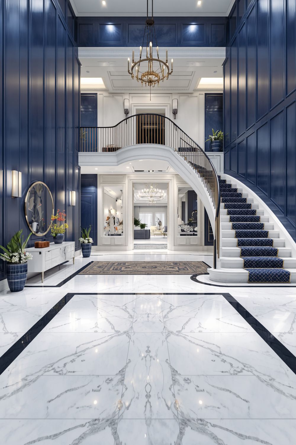 Sapphire panels create a tailored, upscale backdrop that feels fresh against bright marble and a graphic border inlay. A patterned stair runner adds comfort underfoot and reduces noise, making the foyer more family-friendly. Layered lighting highlights the runner’s texture and keeps corners bright. Ideal for anyone who wants color, polish, and a strong stair-focused moment.