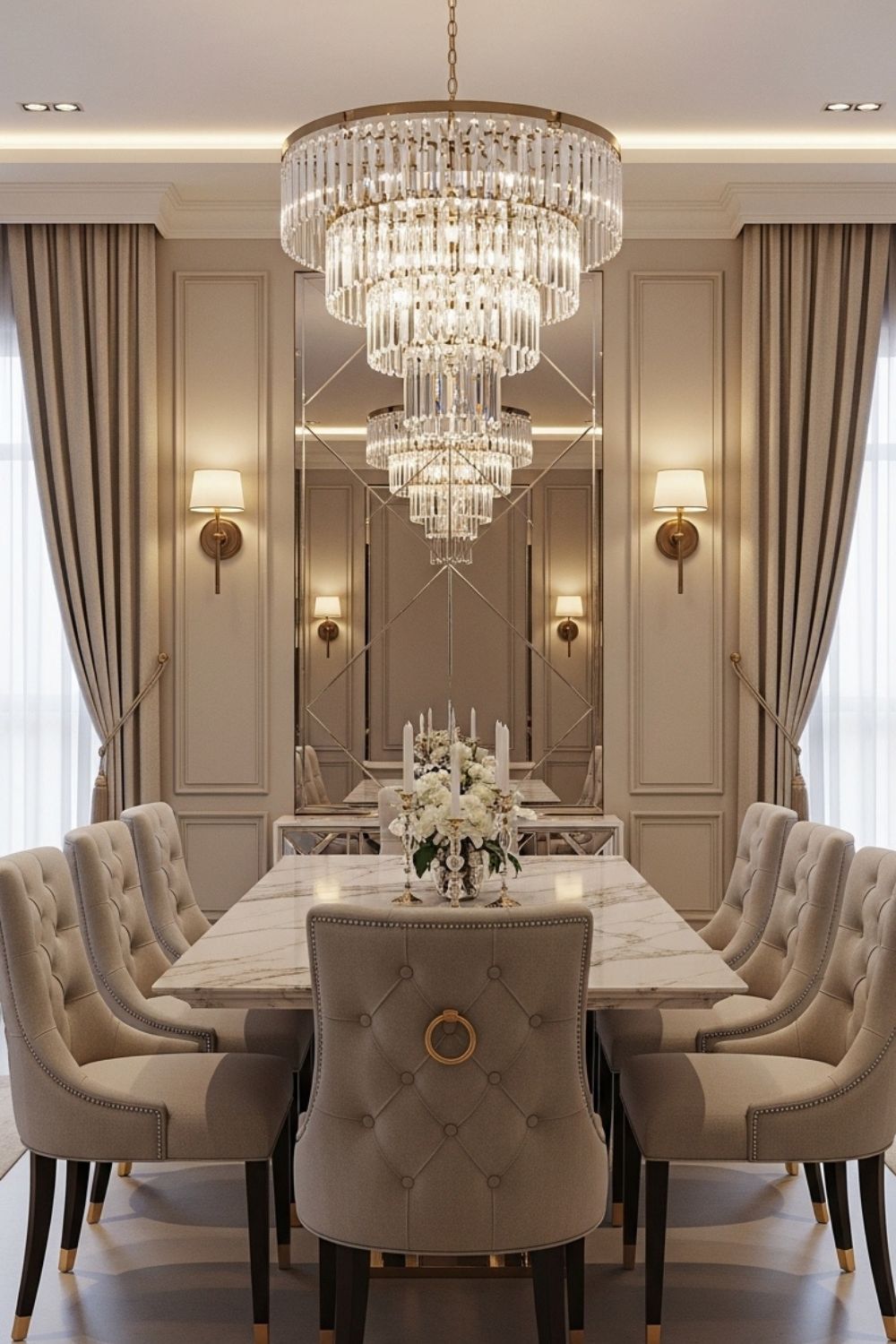 Symmetry gives a modern classic luxury dining room its calm, composed look. This luxury glam dining room centers the marble dining table beneath a crystal chandelier, then uses mirrored wall decor and elegant curtains to frame the scene. Tufted upholstered chairs soften the lines and invite lingering. Gold accents add sparkle without overwhelming, making it family-friendly and beautiful for hosting.