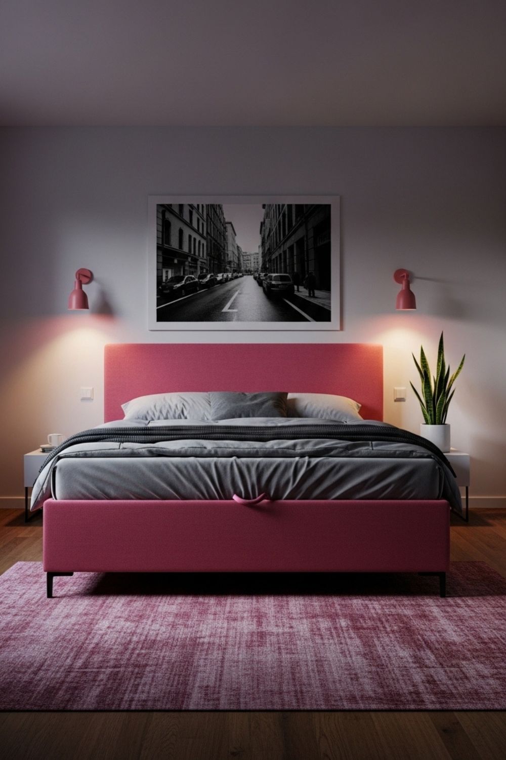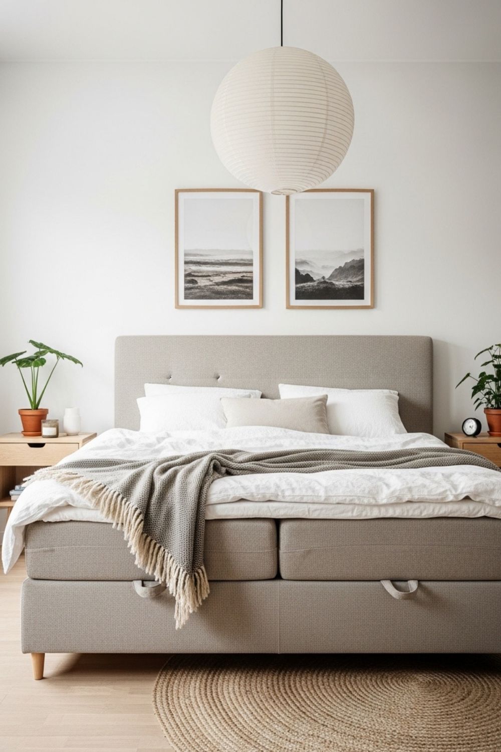 A warm gray Ottoman bed gives this modern bedroom a hotel-style symmetry that feels instantly put together. The padded wall panels and matching lamps create a polished mood, while the storage base keeps spare linens out of sight. Best for anyone who loves a clean, elevated look but still wants their bedroom to function like a smart, organized home.