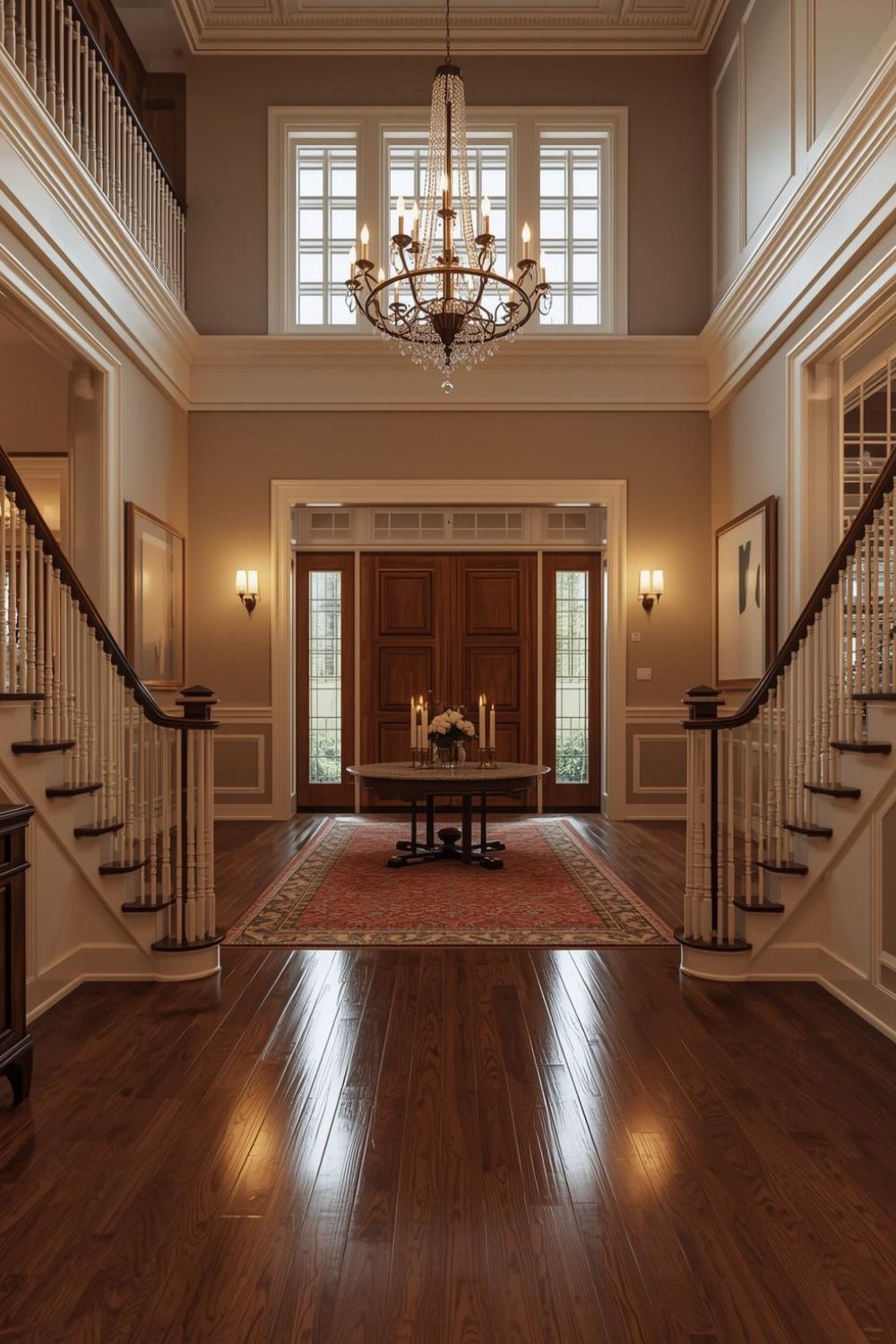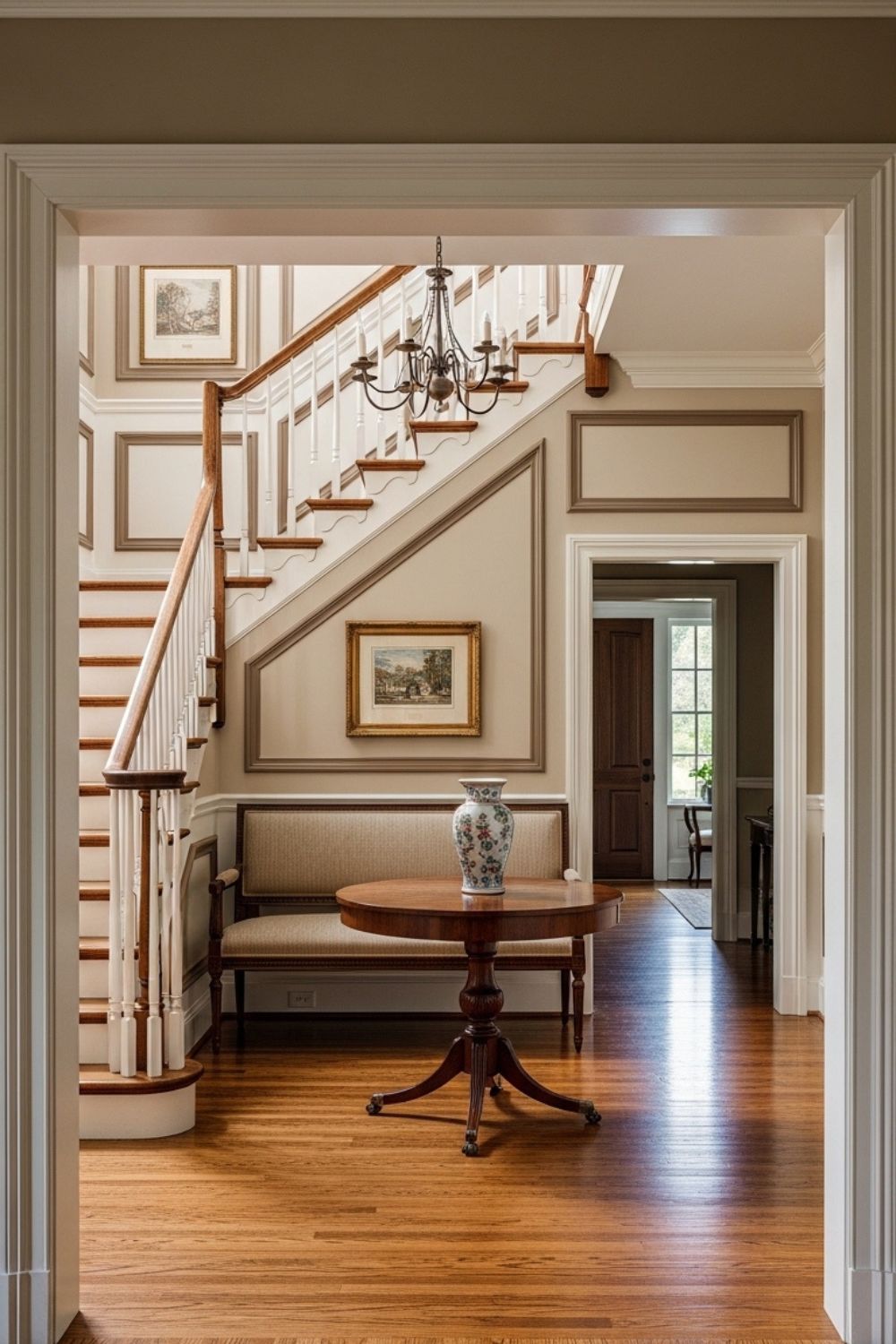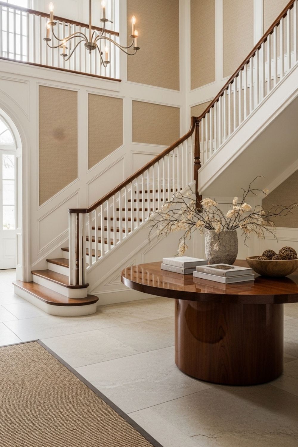 A classic entryway with a grand staircase never goes out of style because it blends beauty with purpose. Warm wood floors, soft neutral walls, and thoughtful symmetry create a welcoming first impression that feels calm and refined. From chandelier lighting and decorative molding to practical center-table styling, these ideas prove traditional design can still fit real life. Choose the version that matches your home: bright and airy, cozy and family-friendly, or quietly luxurious, then add a few personal touches. With the right balance, your entry will feel timeless, comfortable, and effortlessly elegant.
