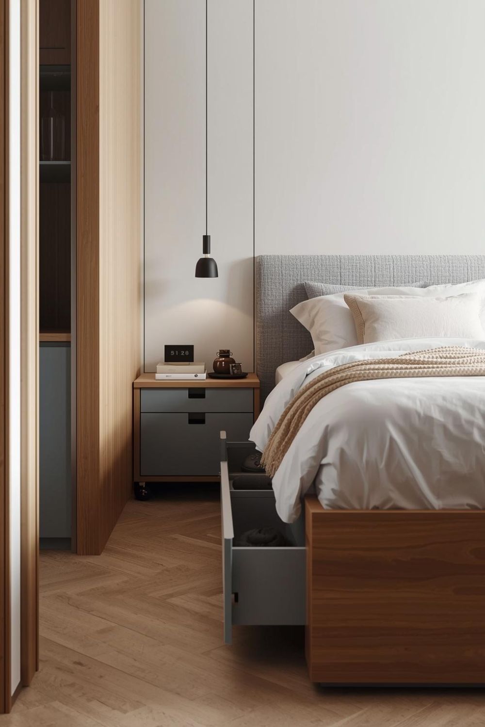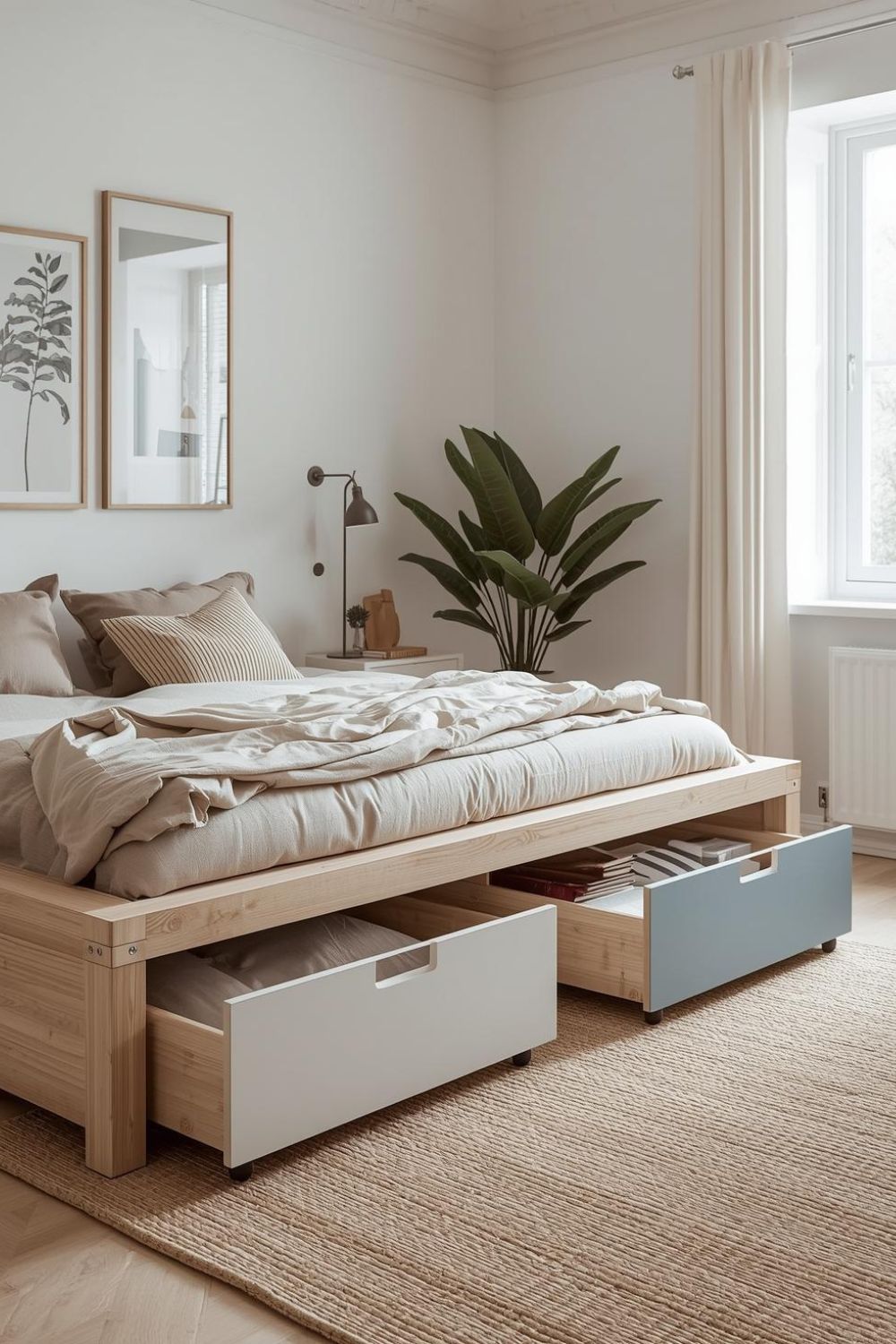 Minimalist Bedroom Organization with Under-Bed Storage Drawers and Natural Wood Furniture
