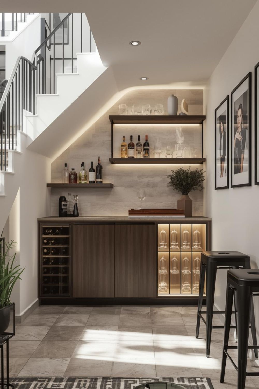Ideal for wine lovers in compact homes, this setup keeps bottles secure and easy to browse. The counter supports serving and light prep, while shelves hold daily glassware at eye level. Bright lighting improves visibility near the staircase and keeps the bar inviting throughout the day.
