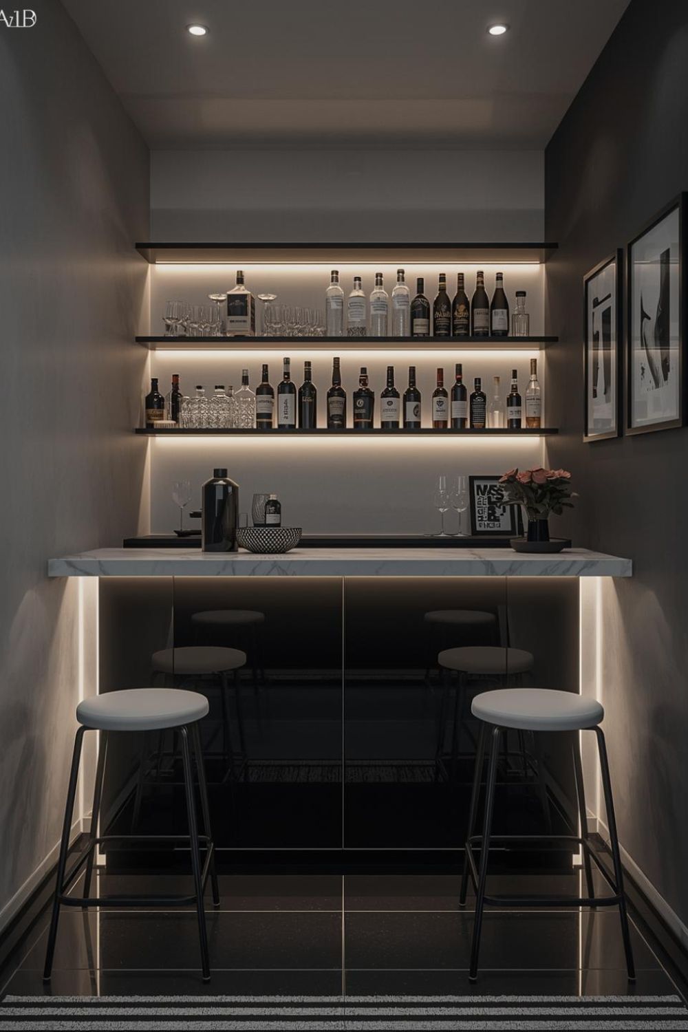 An under-stairs bar is one of the smartest ways to turn leftover square footage into a stylish feature that actually gets used. In this collection of home bar design inspiration, each setup is built around a compact footprint, think small space bar design with a compact home bar counter, floating LED-lit shelves, and a clear display zone for glassware and bottles.